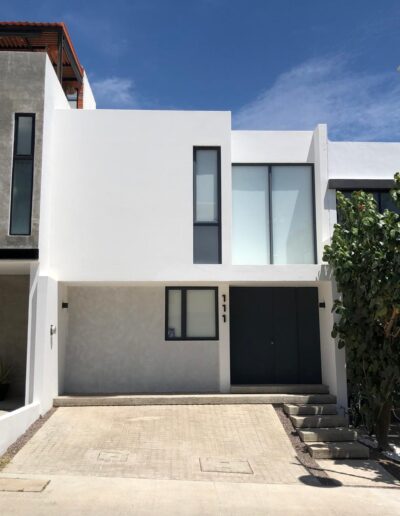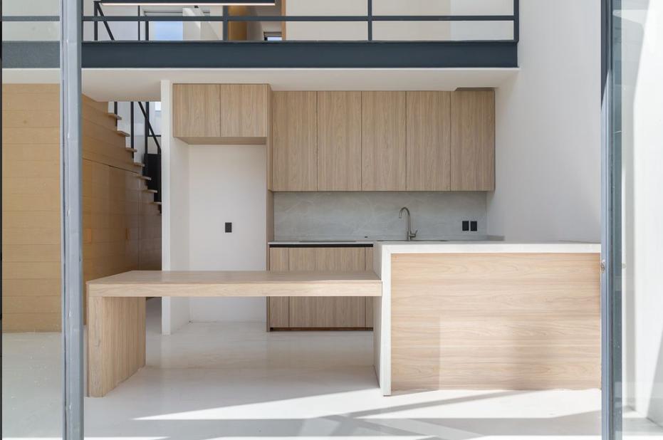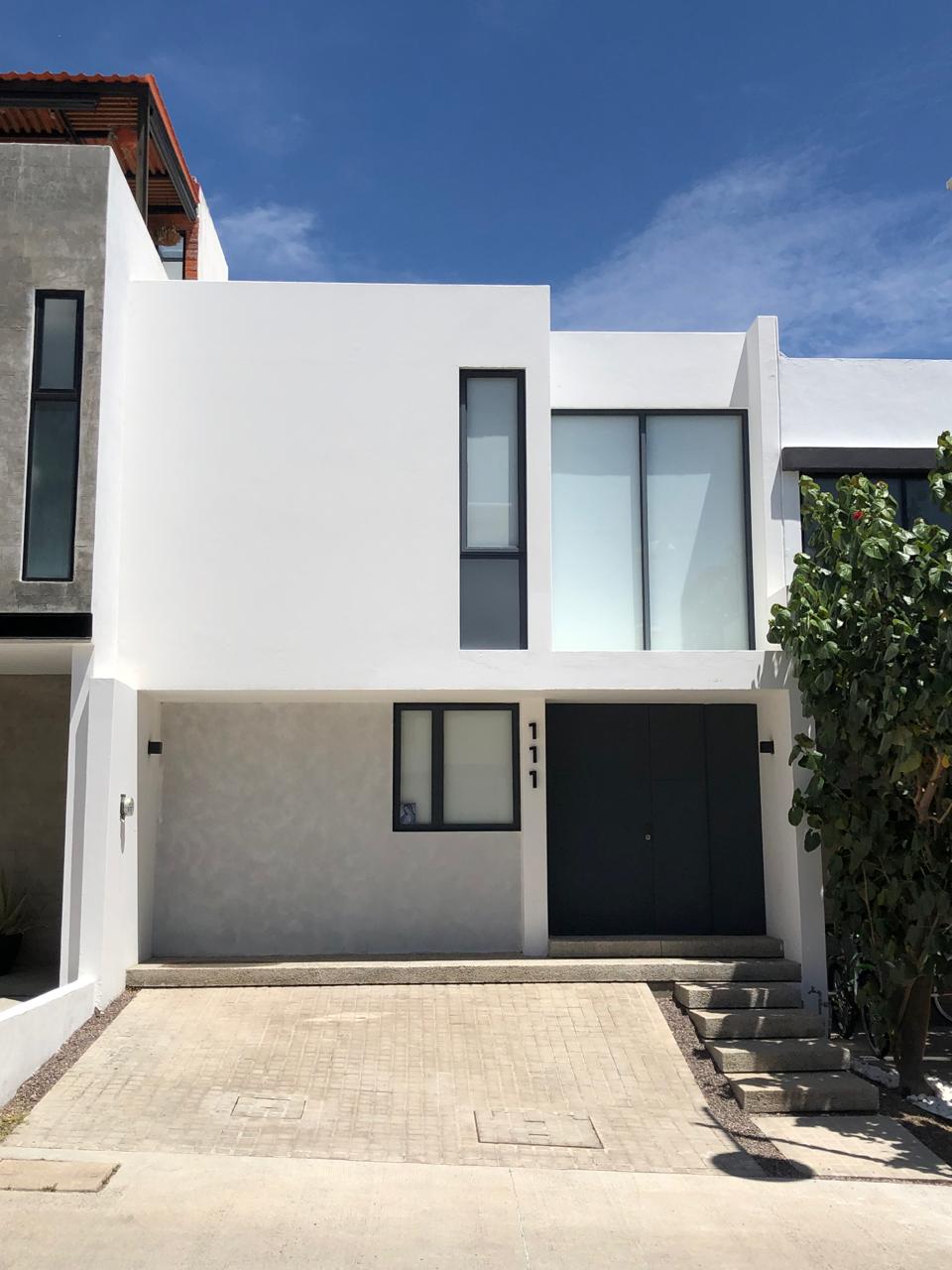 Cochera para dos autos medianos, recamara principal con baño, sala, comedor cocina equipada importada marca KOBER, cuarto de lavado y patio.